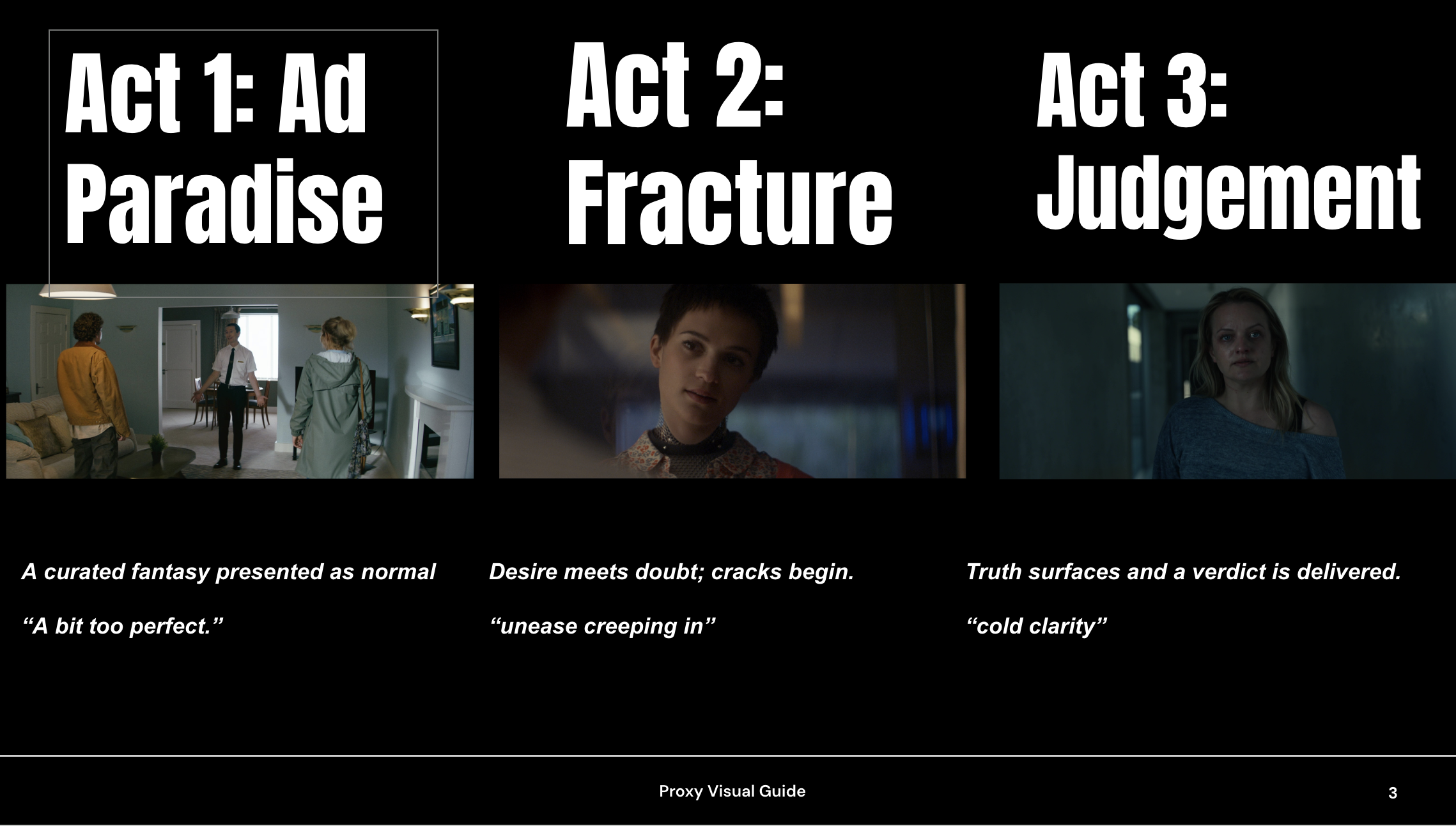 Before we shot I worked closely with directors Diana Porter and Mikel Wisler. We aligned on the vision for the project and I created a look guide to keep the visuals consistent and intentional. The film’s visual language follows a simple three-act structure: Paradise → Fracture → Judgement. I put together a 50-page look book and lighting diagrams, then used that as the blueprint for how we’d frame, light, and move through the story.